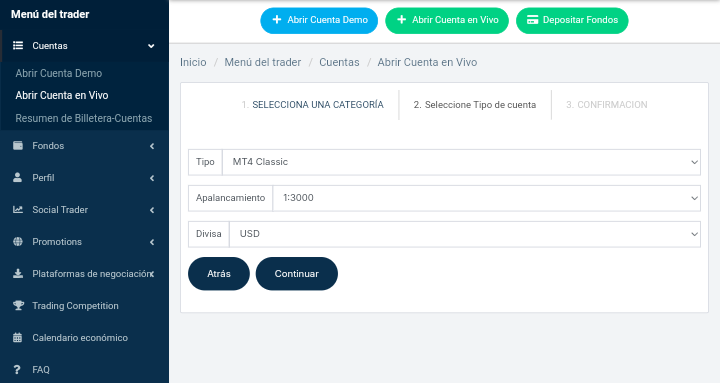 Seleccione un Tipo de cuenta y defina su apalancamiento y divisa: