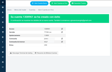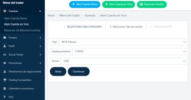 Seleccione Cuentas de Trading en el menú principal y haga clic en continuar: